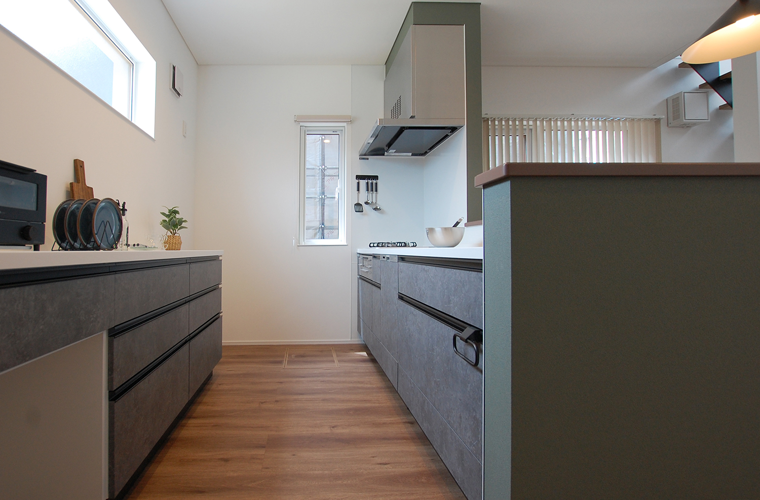 ダークグリーンの差し色&スタイリッシュなペンダント照明が毎日の食事を彩ります