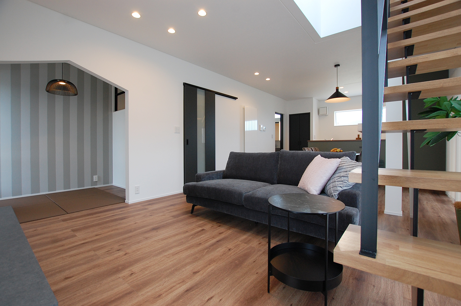 スケルトン階段と吹き抜けが空間の広がりを生み、自然光がたっぷり入る、心地よいリビングです。