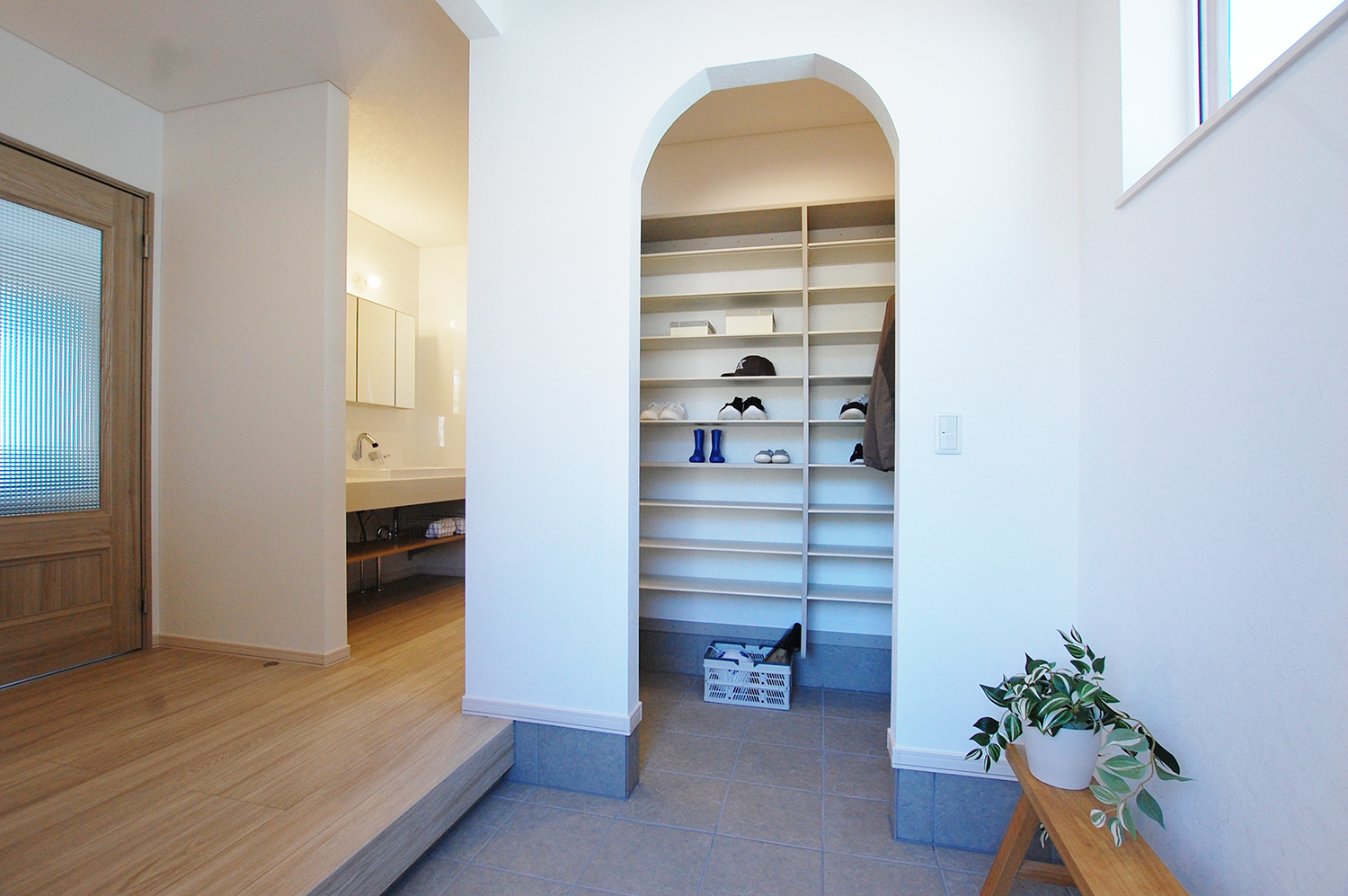 アーチ型の開口がかわいらしいシューズクローゼット。帰宅した家族をやさしく出迎えてくれる、デザインと機能性を両立した空間です。