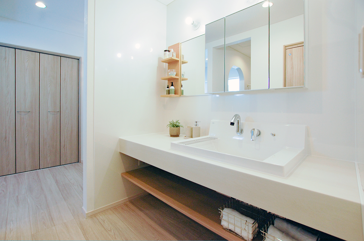 玄関からすぐの場所にあるワイドな洗面カウンター。3面鏡収納とオープン棚で使いやすく、深型ボウルで水はねも軽減。家族みんなが快適に使える設計です。