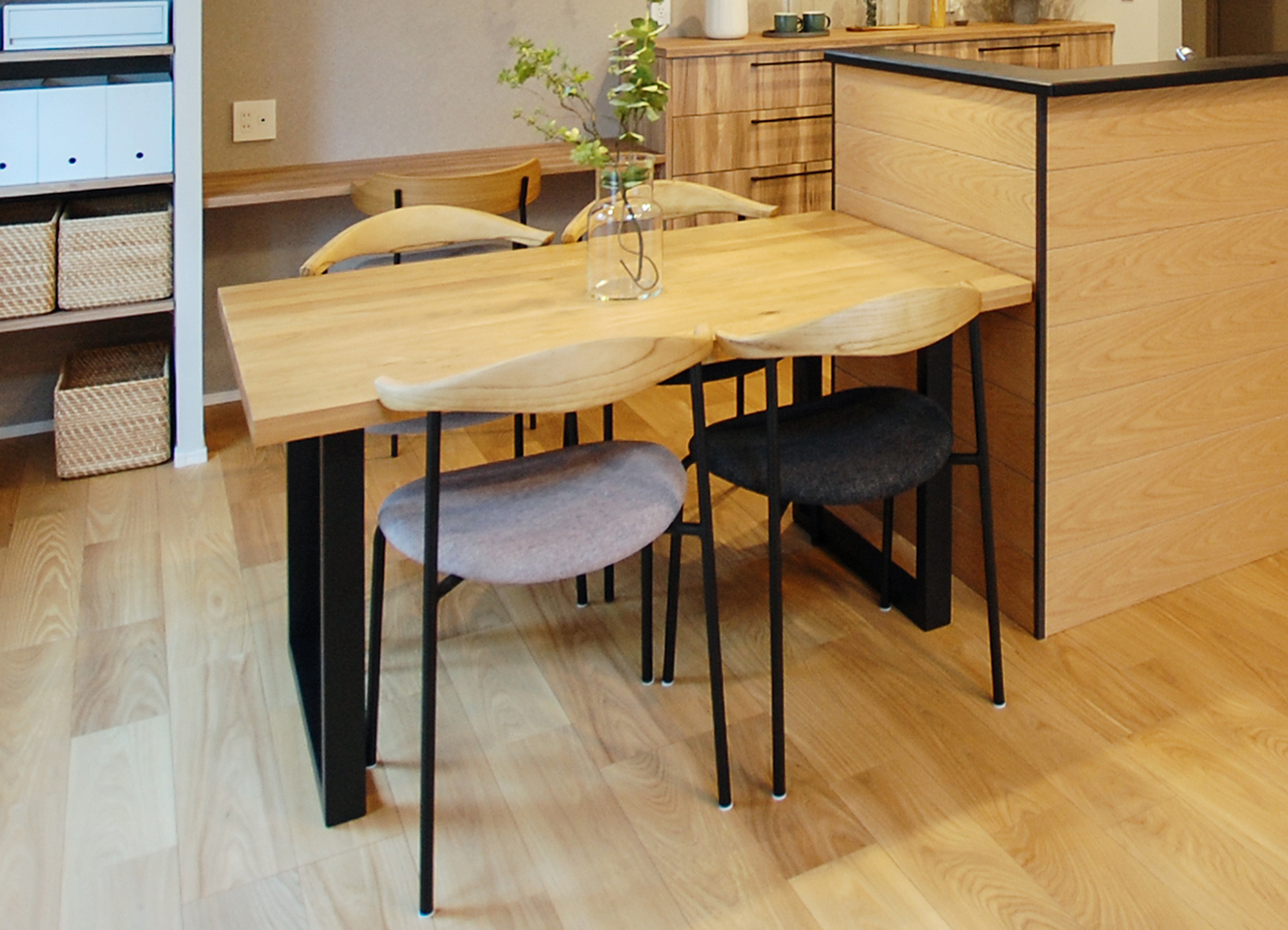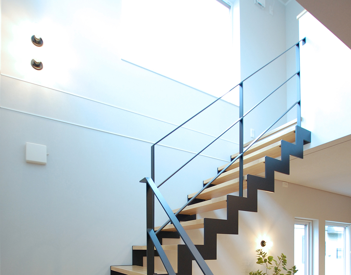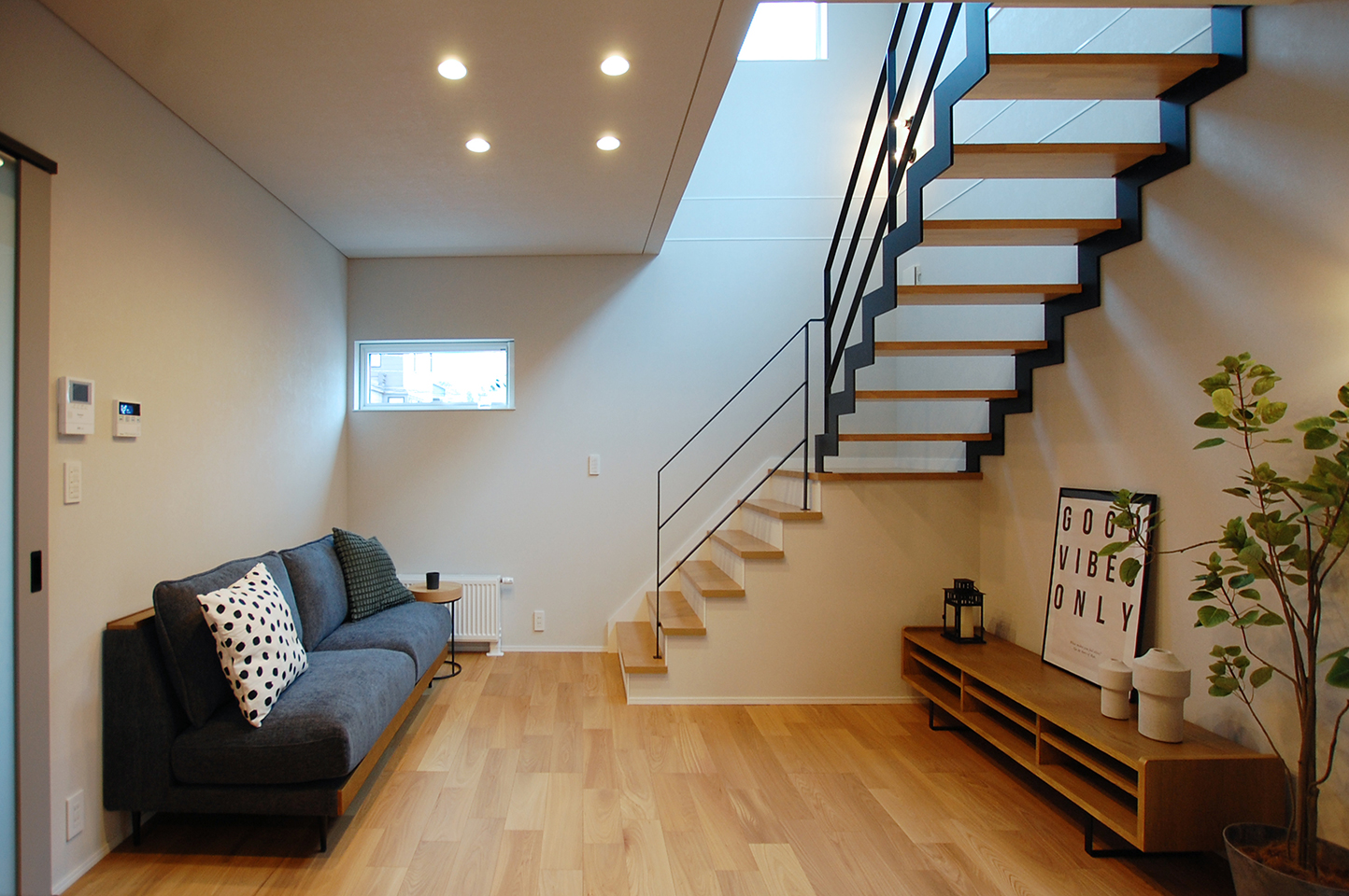 吹き抜け階段とLDKが一体になった、広く感じる室内空間。