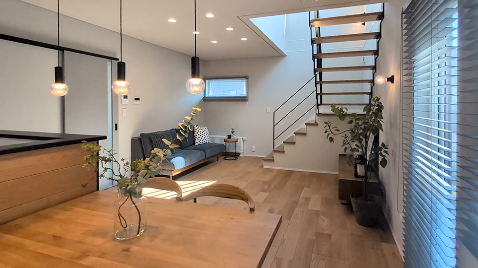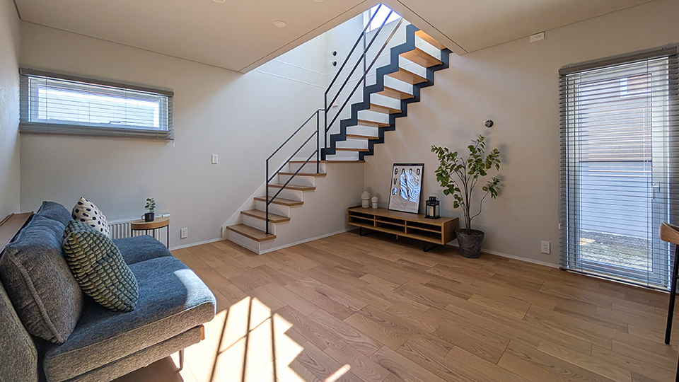 吹き抜けと階段配置で、視線の抜けが実現。空間全体が広く感じられる設計になっています。