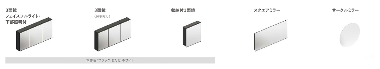 定番で使いやすい「3面鏡」や「収納付1面鏡」はもちろん、まるでホテルのような洗練された空間を演出できる「スクエアミラー」や「サークルミラー」も選べます。