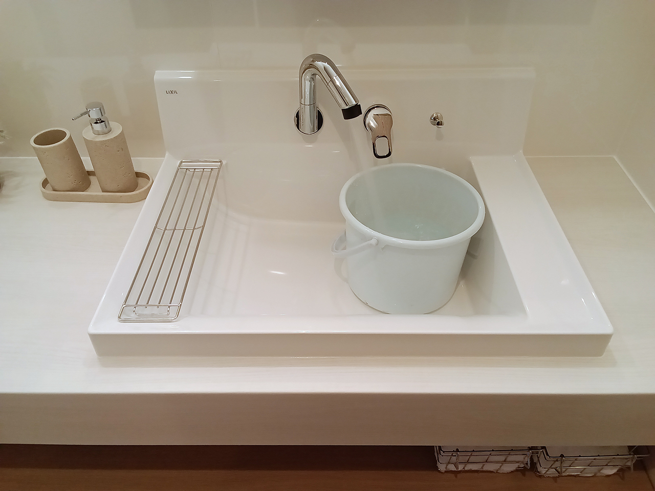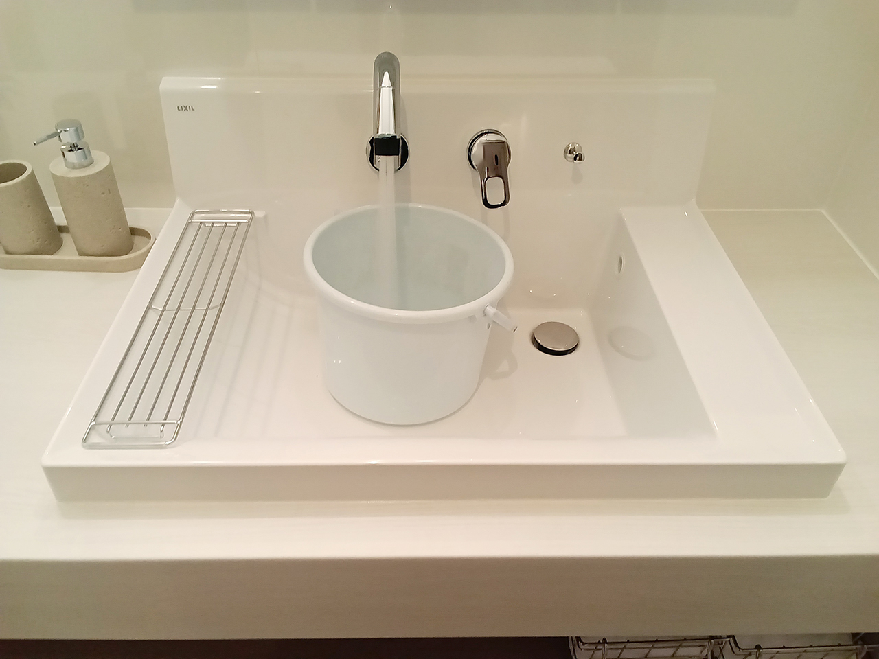広くて掃除のしやすいボウル形状や、使いたい位置にくるくる回せる水栓でつけ置きしながら手洗いも可能です。