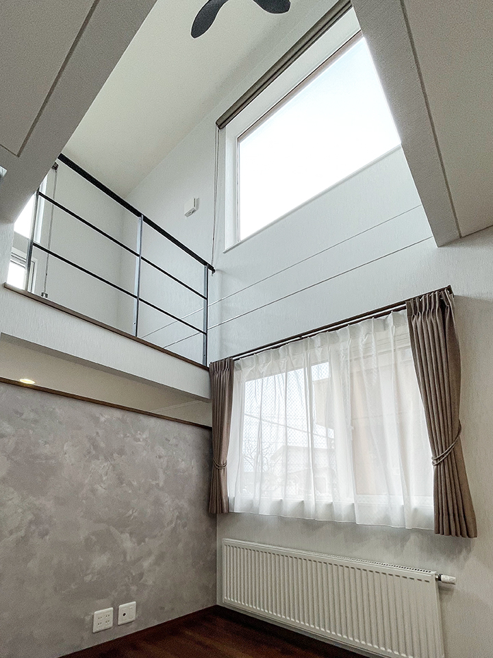 吹き抜けの高所に設けた大きな窓からは、たっぷりの自然光が降り注ぎます。
