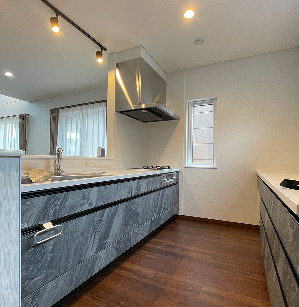 キッチンは、リビング全体のトーンに合わせて、家具のような佇まいの石目調デザインをセレクトしました。