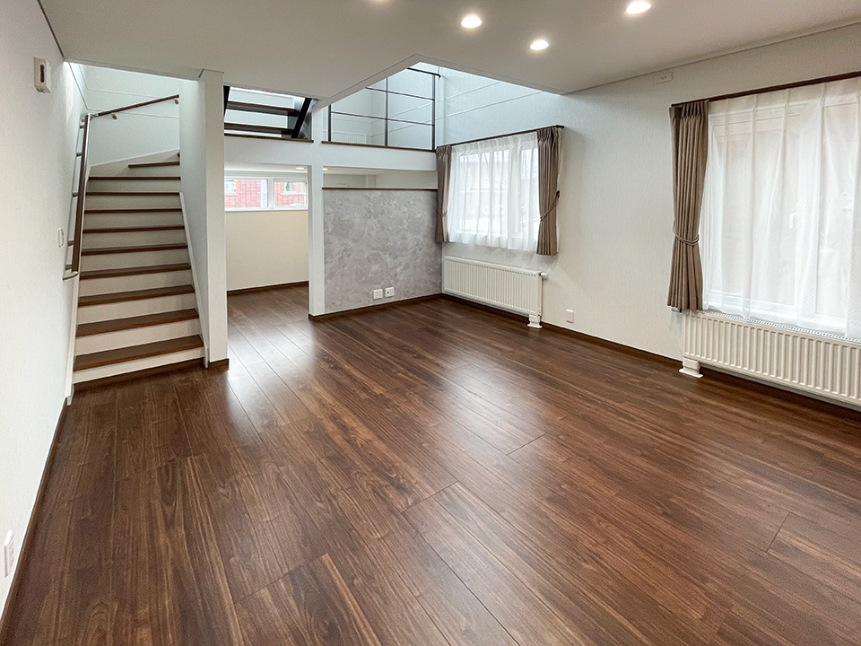 玄関を抜け、リビングに足を踏み入れると、外観の重厚なイメージとは一転、明るく広々とした空間が広がります。