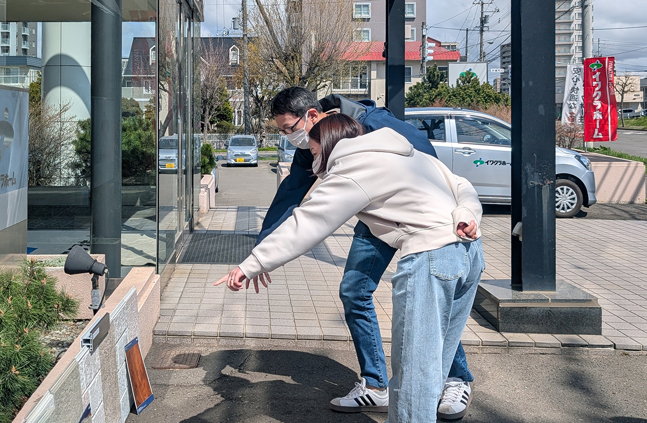 M様も、太陽の光でよりリアルな質感が増した木目調のサンプルを「どちらの色にしよう…」と、真剣な表情で見比べていらっしゃいました。