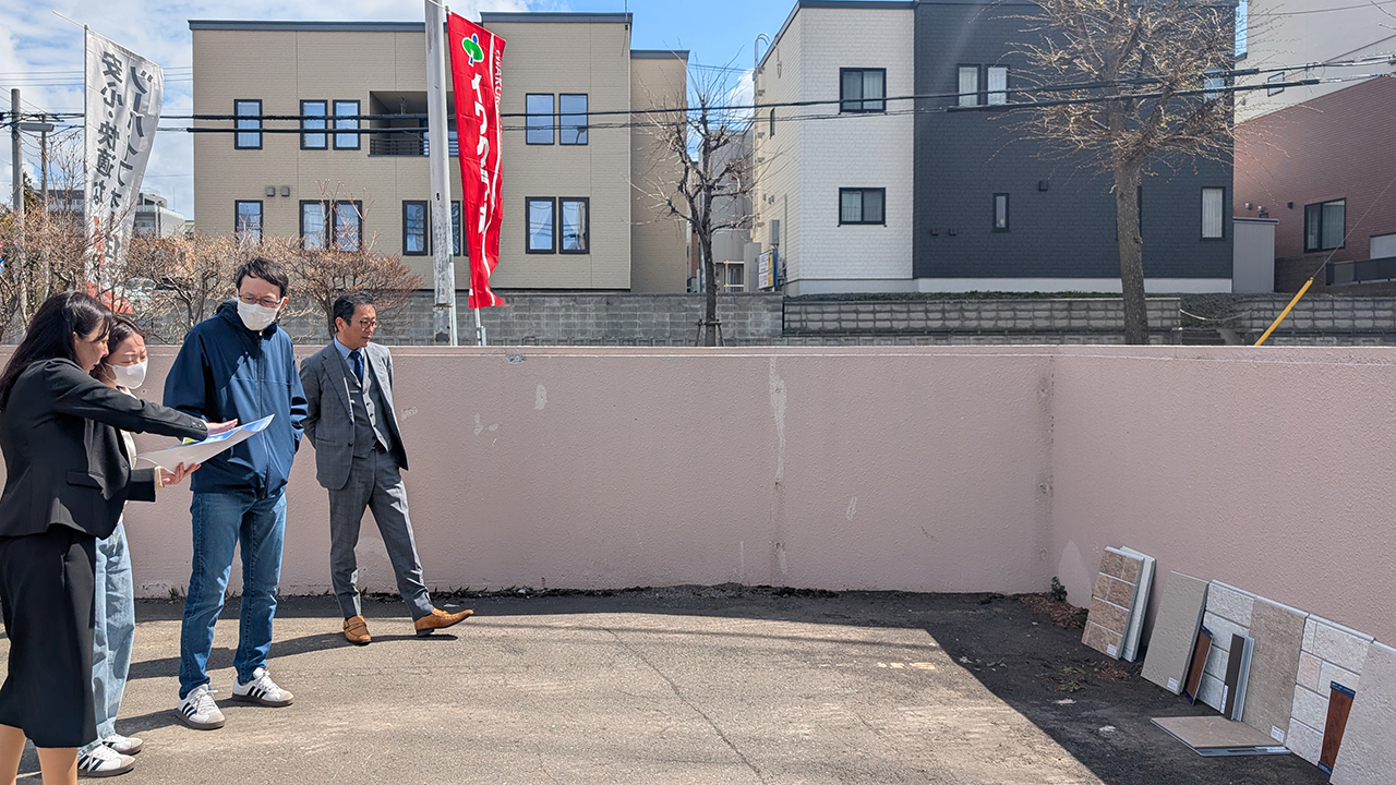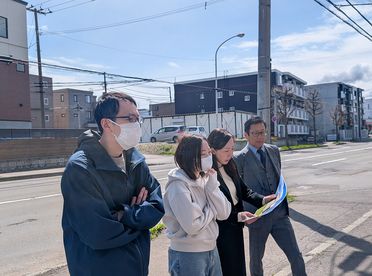 こうして道路の反対側まで離れて見ることで、実際の建物のボリューム感や、街並みの中でどう見えるかをより具体的にイメージしていただきます。