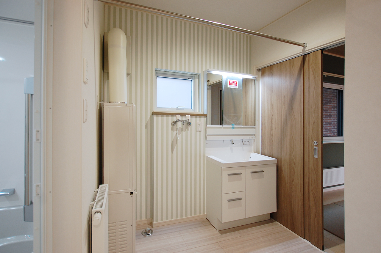 キッチンから続く洗面脱衣室は、清潔感のあるサンゲツのストライプ柄クロス(SP2593)をアクセントに採用しました。