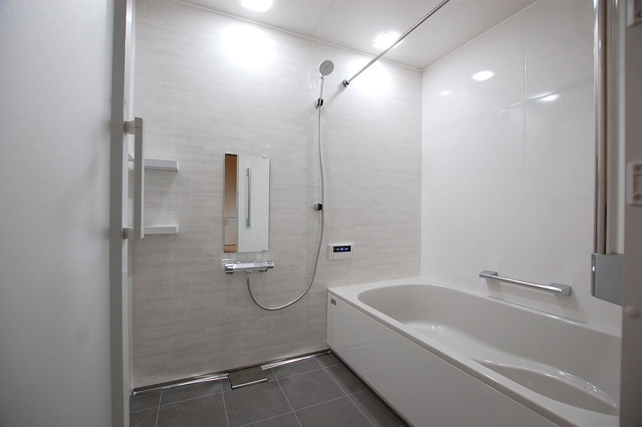 ゆったりとしたワイドサイズの浴槽と、落ち着いた色味の壁パネルがリラックス感を高めてくれます。