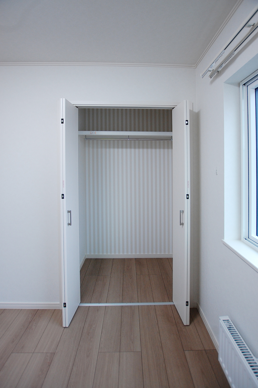 扉を開けた瞬間に目に入るのは、すっきりとしたストライプ柄のアクセントクロス(SP2592)。