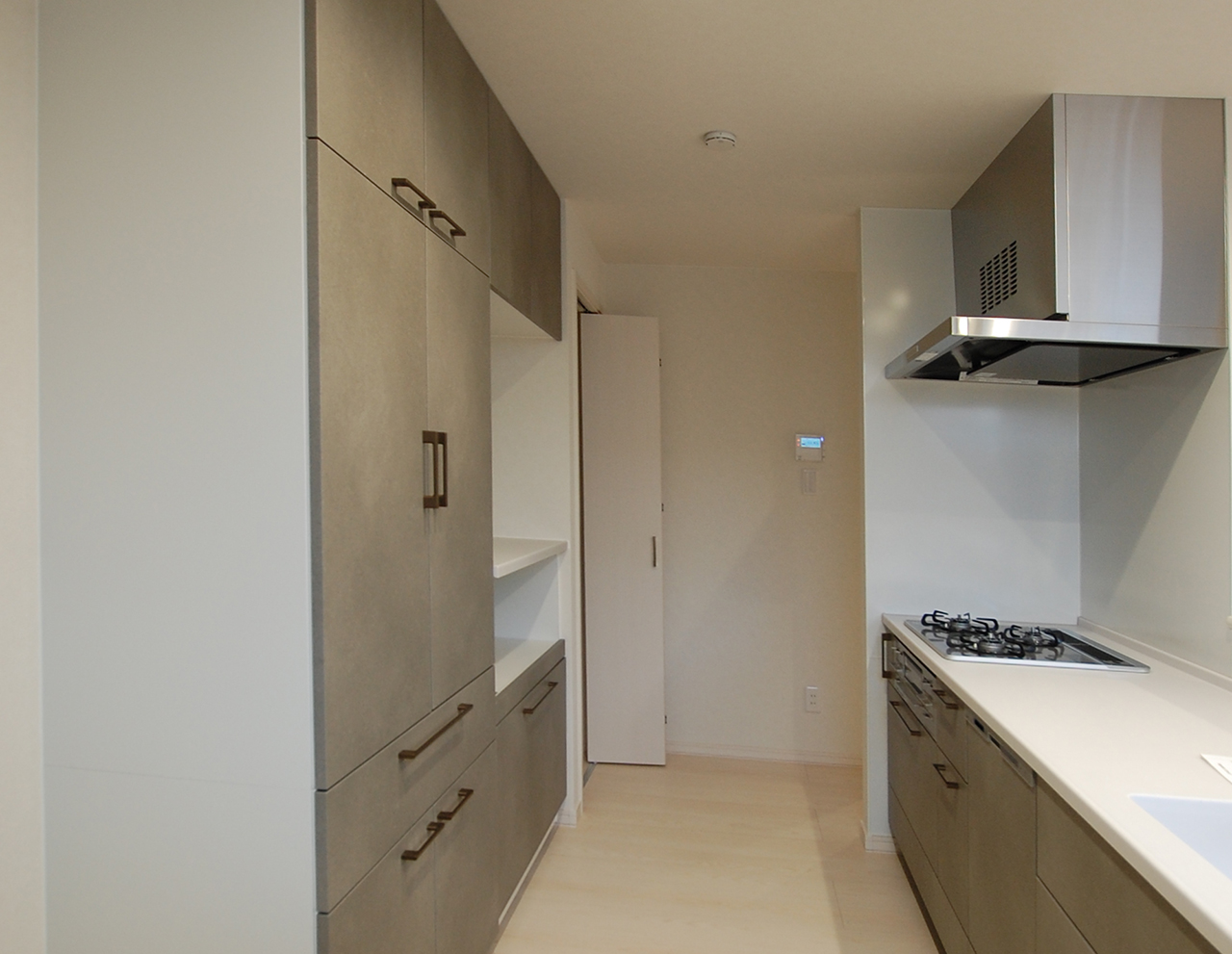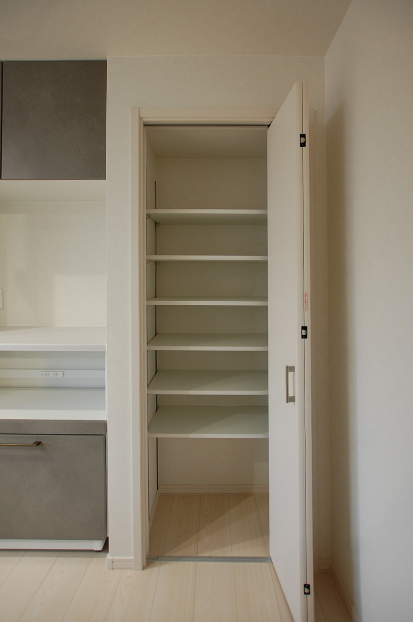 さらに、キッチンの奥(カップボードの隣)には扉付のパントリー収納を配置。