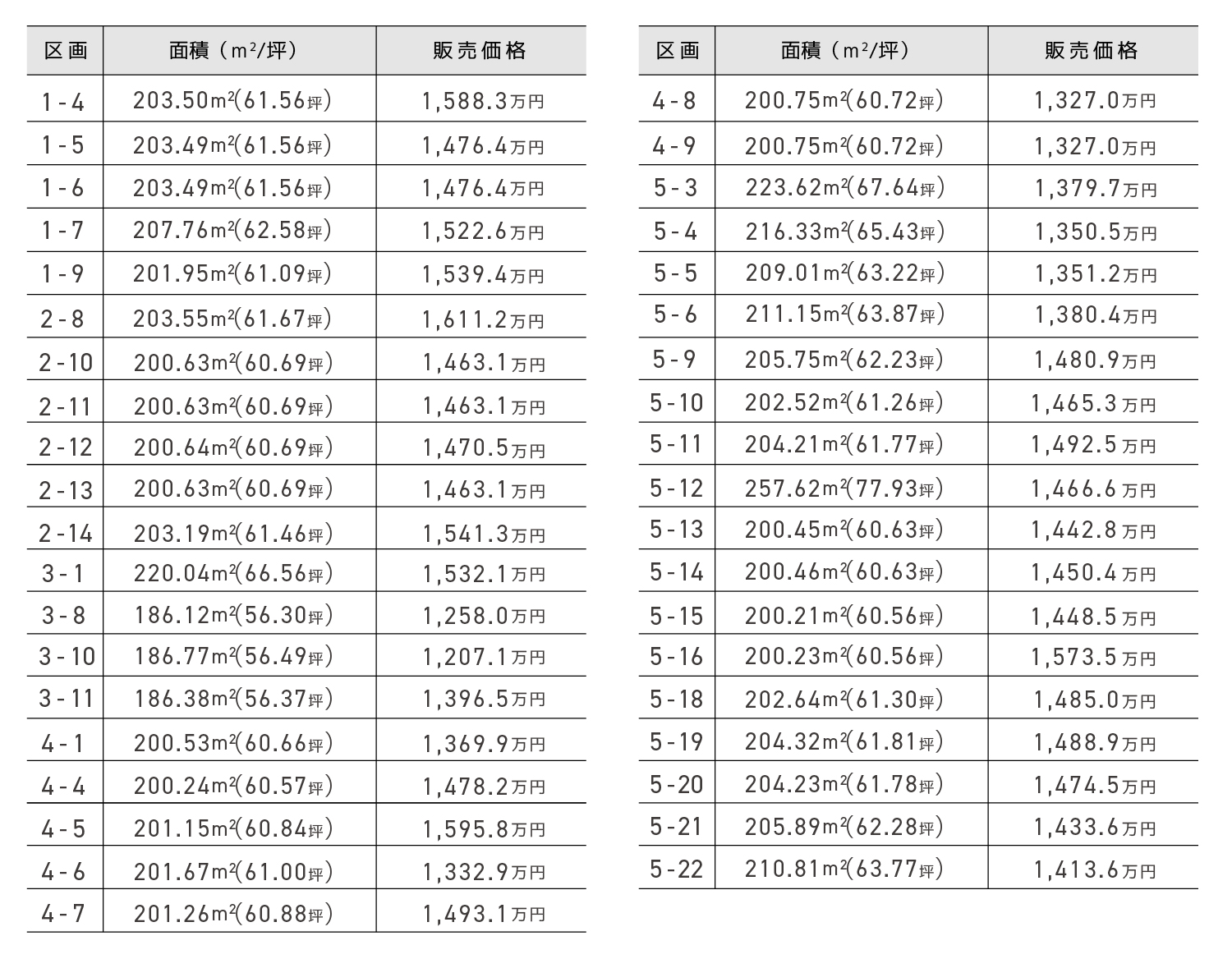 | 敷地面積 | 186.38㎡(56.37坪:3-11)~257.62㎡(77.93坪:5-12) |