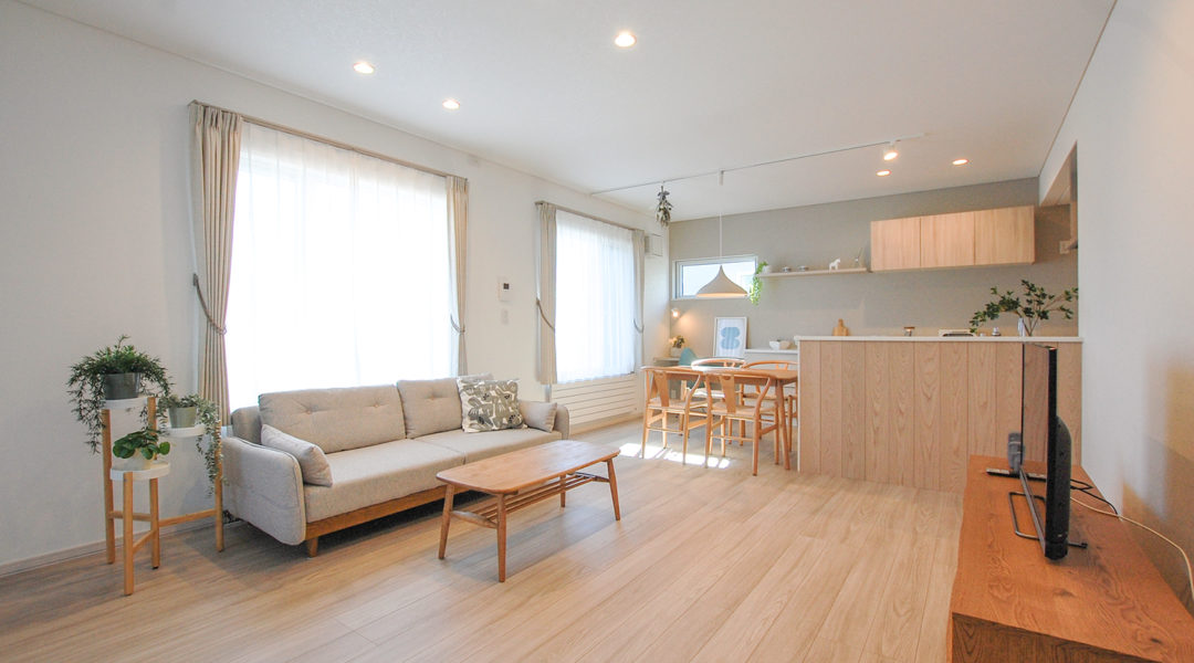 家族が自然と集まる、開放感あふれるリビング。ダイニング・キッチンとの一体感で、家事をしながらでも家族との会話が弾みます。