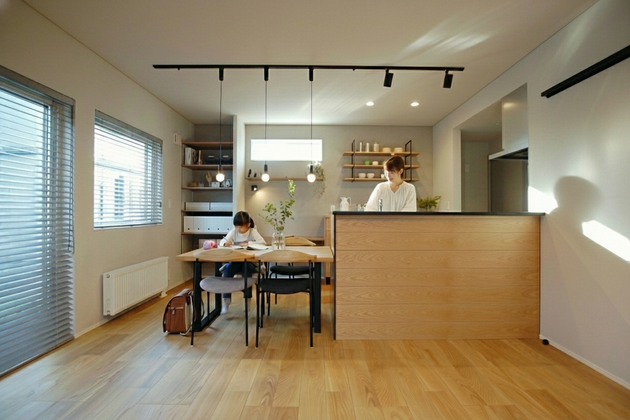 家事動線とコミュニケーションを両立。 配膳しやすい横並びのダイニングと、家族との会話が弾む対面キッチン。コンパクトな空間でも、ゆとりを感じられる心地よいLDKです。